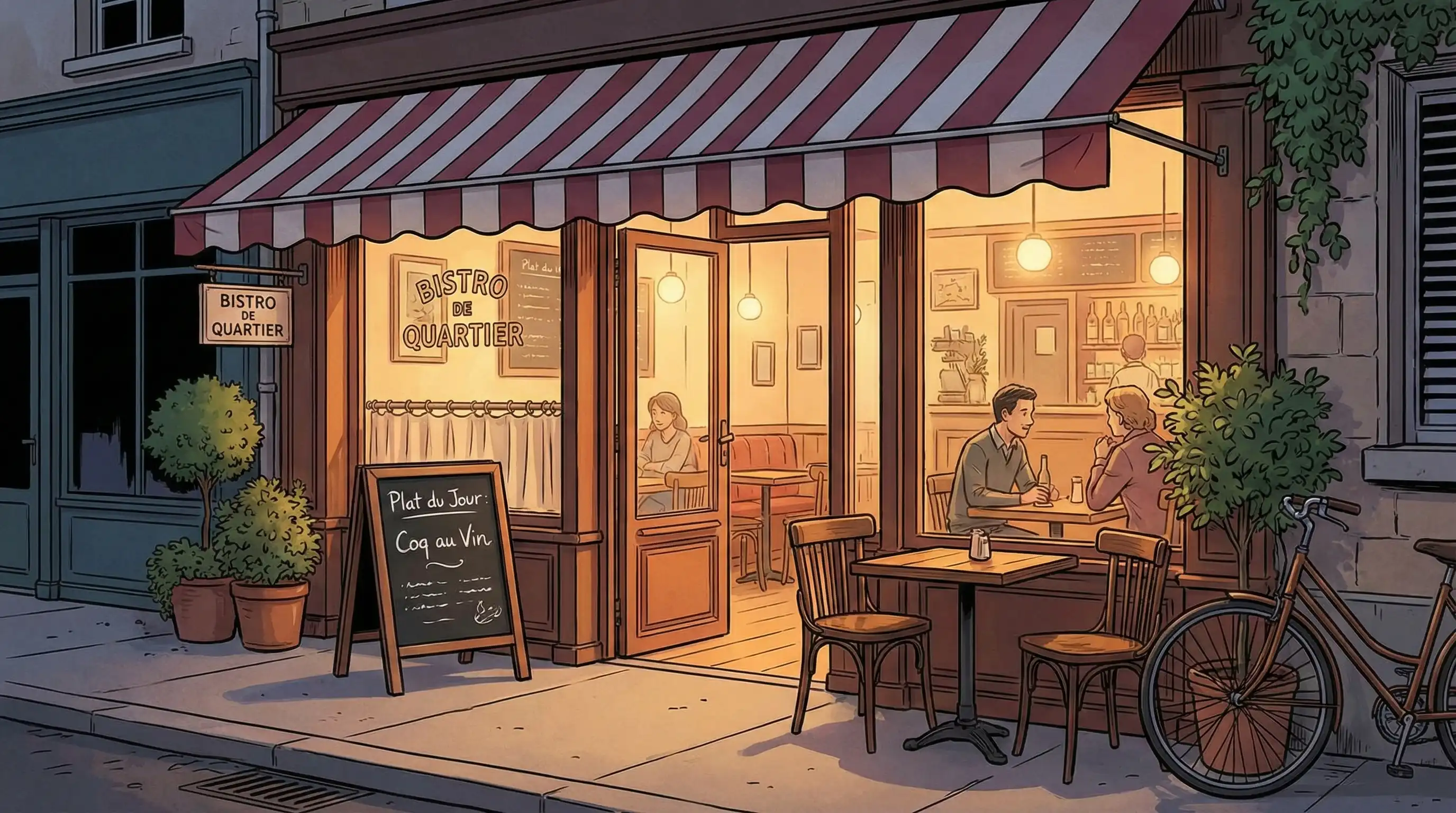 Ein Bistro-Restaurant ist eine einzigartige Art des Essenserlebnisses, bei dem Qualität, Zugänglichkeit und Intimität im Vordergrund stehen. Es handelt sich um ein Restaurant mit Tischservice, das entweder klassische französische Küche oder von der Region inspirierte Gerichte in einer freundlichen Atmosphäre zu angemessenen Preisen serviert. Bistros servieren Speisen, die sowohl den Hunger als auch die Seele stillen, in einer Umgebung, die der Begegnung dient. Dies unterscheidet sie von Fastfood, bei dem es vor allem um Schnelligkeit geht, oder von der gehobenen Gastronomie, bei der es um formelle Zeremonien geht.